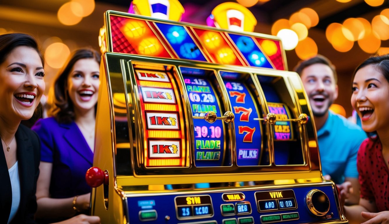 Sebuah mesin slot yang berwarna-warni dan cerah dengan lampu berkedip dan gulungan berputar, dikelilingi oleh pemain yang bersemangat dan penuh harapan